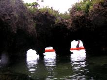ツアー@石垣島三つ子穴 波が打ち寄せるたび、海水は岩を洗います。水が行ったり来たりするうちに、長いながい時間をかけて、岩は削られていくのでしょう。大きな台風でもきたら、すぐにでも崩れ落ちてしまいそう。三つ並んだこの穴は、いつまでここにあるのでしょうか。この日、リー... 2006.04.24 4ツアー@石垣島