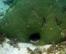 石垣島の海サンゴの家 三角サンゴにぽっかり空いた、まぁるい穴。奥が深く、よく見えませんでしたが、確かに魚が出入りをしています。住みやすいのでしょうね。大きな魚が追い掛けてきたら、ササッ~!と隠れてしまえばこっちのものです。 2006.11.23 3石垣島の海