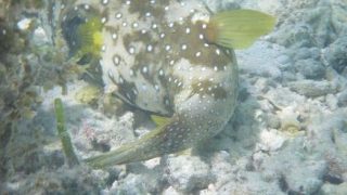 ツアー@石垣島今日の主役 じーっと砂地にたたずむ後ろ姿。 なぜだかじーっと動きません。そこにいるのはバレてるよ~! サザナミフグです。私の方をチラリ!でも、動きません!!お腹に卵でもあるのかな??何をしていたのでしょうかね~。シホ 2009.09.07 0ツアー@石垣島