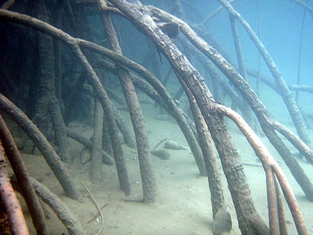 八重山諸島水中に並ぶマングローブの根森。