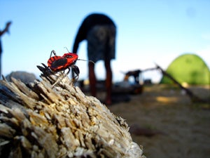 狙う者 part2 石垣島の海 X Facebook LINE LinkedIn コピー コメント 2005.10.31朝日がゆっくりと昇り、辺りの空気が少しづつ暖かくなる。と、そこに、光に誘われるように虫一匹。流木の上にたたずんでいる。『おおっ!旨そうな奴がいる』奇怪模様。赤に黒とは、いかにも毒々しい。表面はつるっとしていて、周りが微妙に反っている。まるでプラスチックのおもちゃのような質感。上から撮ってみた。(写真をクリックすると、ちょっと大きく見えます)思わず夢中になって撮った。何枚撮っただろうか...命名:ダ-ス・モール虫