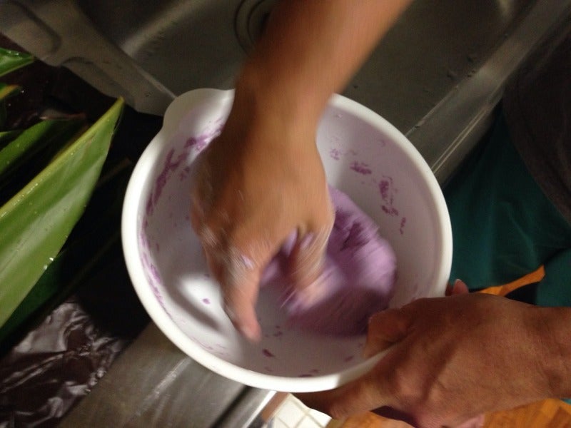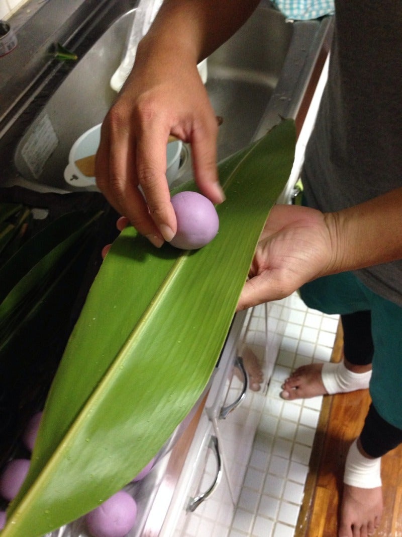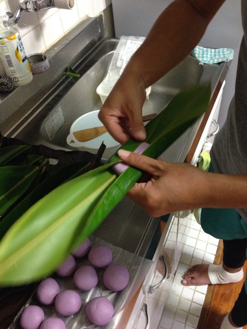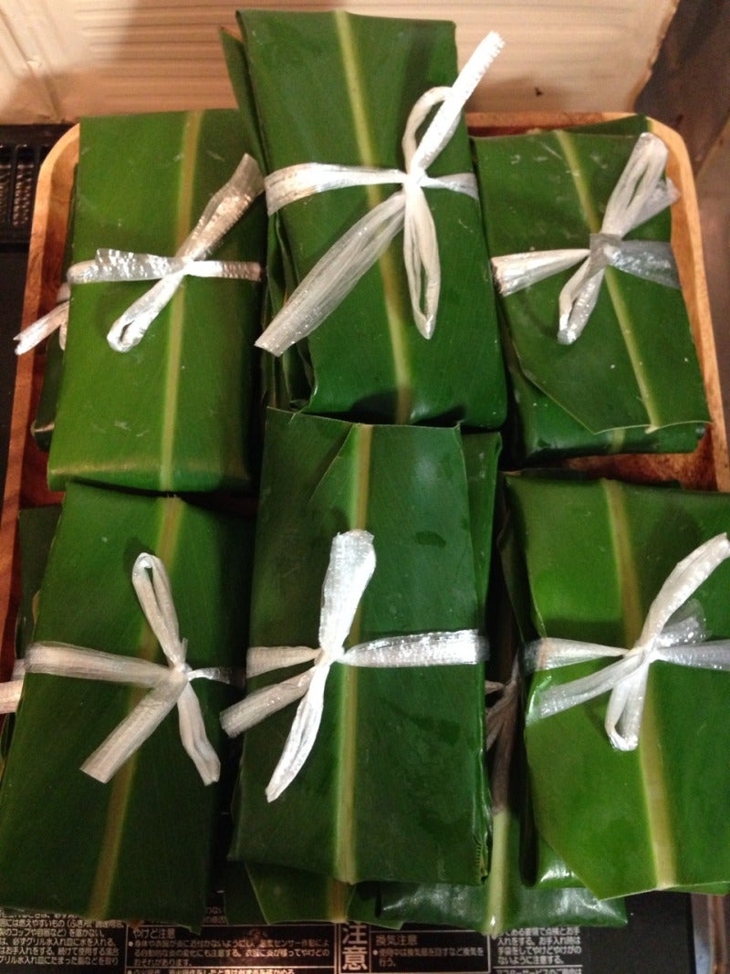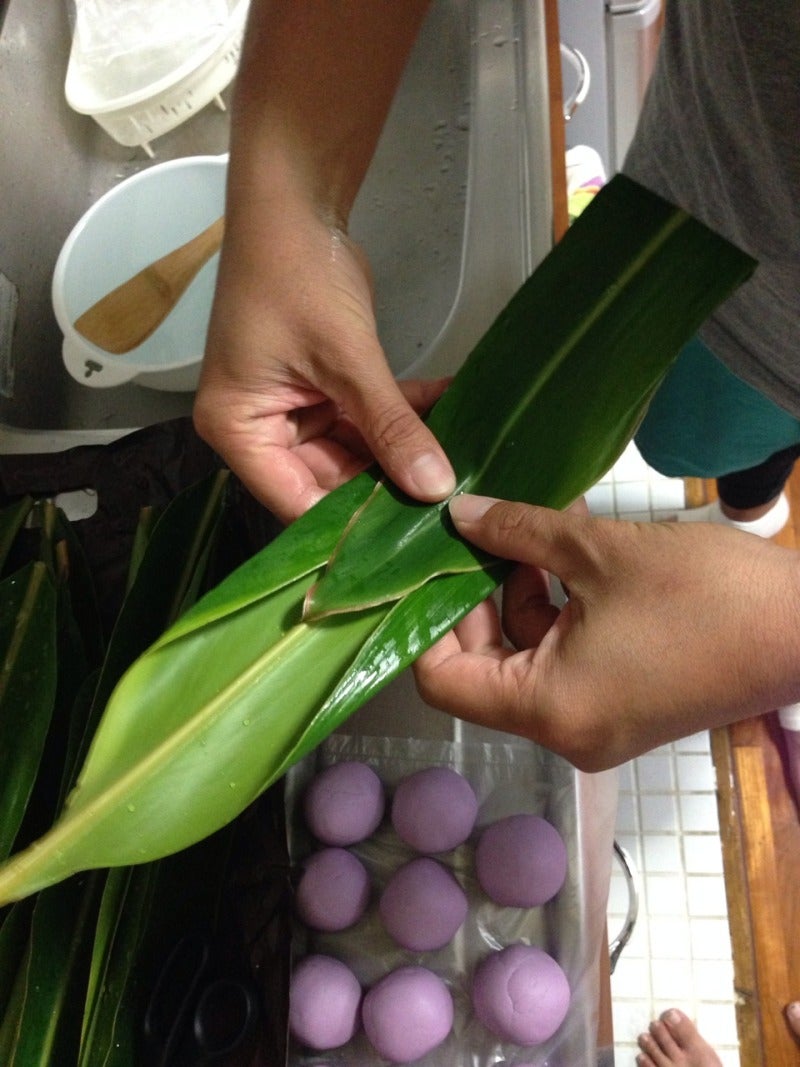 丸めたやつを月桃の葉にのせて包んでいきます。