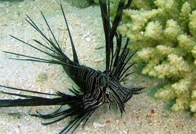 ミノカサゴ君、キミはいつもおしゃれだねぇでもね、さんごに群れる、スズメダイの子達を狙ってた。
