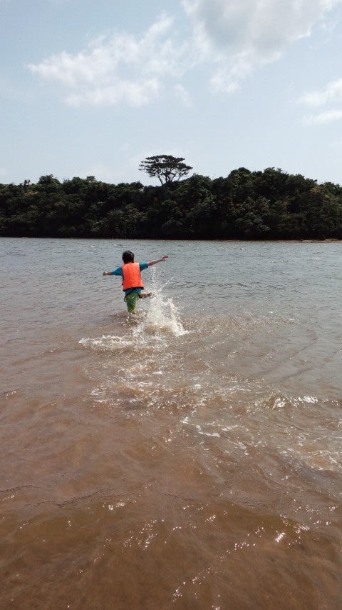 干潟に上陸したら、もちろんカニさんをたくさん捕まえましたが、水を見たら入りたくてしょうがない!Rくん、水の中を駆けます、駆けます!小学5年生のお姉ちゃんも追いかけます。ふたりで転んで笑います!