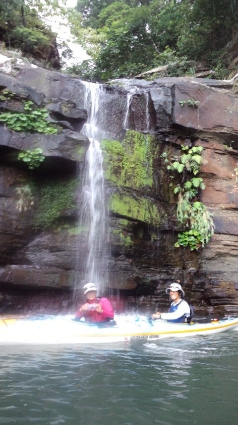 まず海を渡り、入江の奥にある滝を目指します。夏なら身体ごと突っ込みますが、ちと冷たく控えめなアプローチ。それでもしぶきがかかり爽快です!