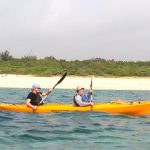 西表島の仲間川ツアーでよくある風景。カヤックと遊覧船のすれ違いの時にお互い手を振り合います。今日のお客様もノリノリで手を振ってくださいました。距離が近い時には「楽しい?」「頑張って」と声がかかることも。