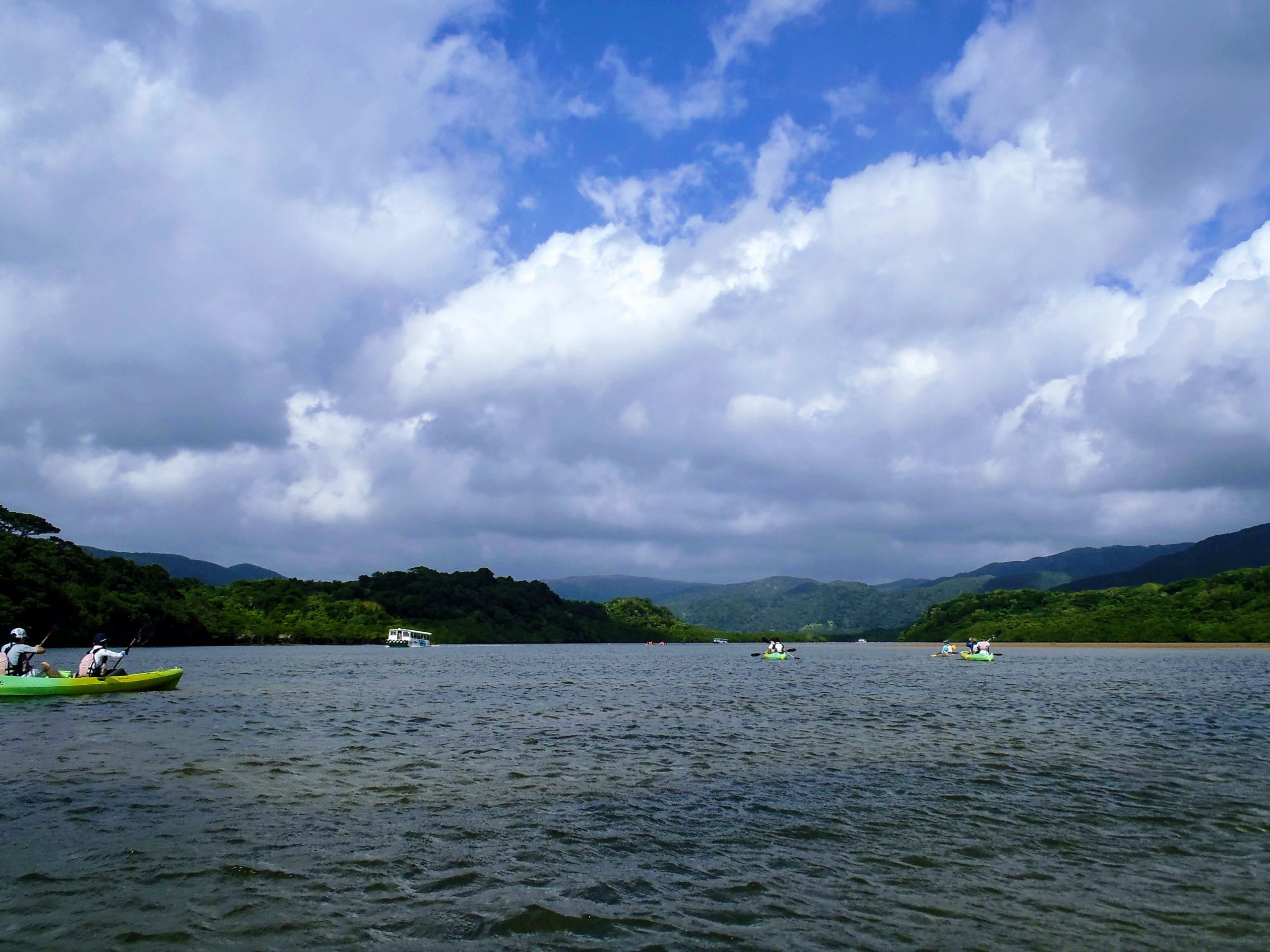 最初はワイドな山並みビューの中、カヤックで進みます。
