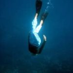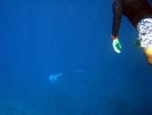 彼の下、水深15m位のところを、マンタが羽ばたいている。