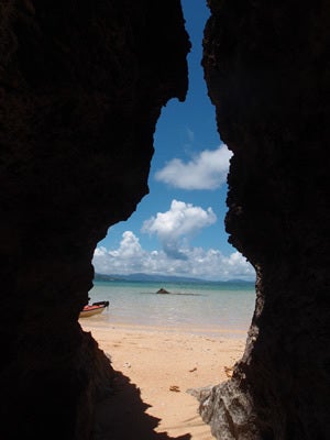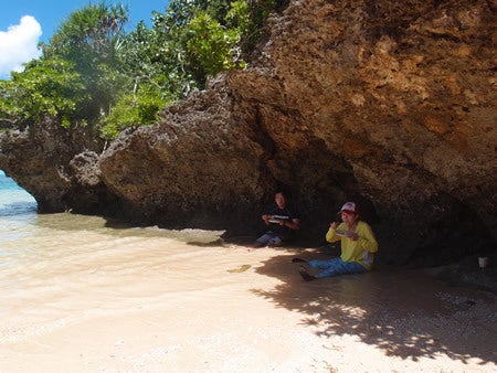 ランチは琉球石灰岩の日影で。